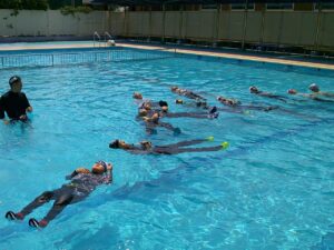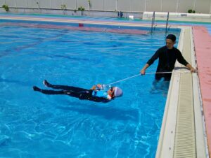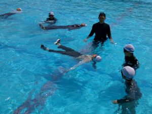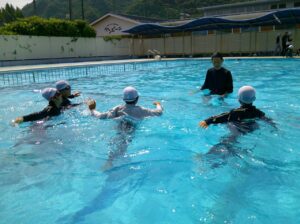 衣服を着た状態で水の中に入り、動きにくさの確認や浮く体験をしました。また、着衣状態でも落ち着いて浮いて呼吸ができるよう指導していただきました。いざというときには、ペットボトルなどを使って浮いて待つことや川や海などで遊ぶときには、ライフジャケットを活用するなど、水遊びの安全に関する学習を行いました。