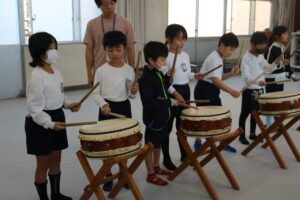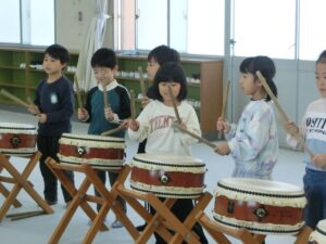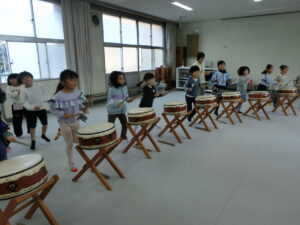 全身じゃんけんや歌に合わせて体を動かしながら太鼓をたたいたりなど、いろいろな活動を行いました。どの活動も太鼓🥁の音やを感じながらとっても楽んでいました。終わった後も「楽しかった!」「またやりたい!」と笑顔😊いっぱいでした。