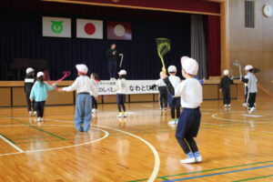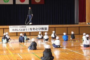 子供たちがスポーツの楽しさを味わい、運動に親しむ習慣を身に付けたり、技術向上を目指して行われる「岐阜県トップアスリート出前指導」が1年生の『なわとび』で行われました。指導してくださったのは、特定非営利活動法人NPO総合体操クラブの坂本先生と臼井先生です。トップアスリートというだけあって、特に臼井先生は、新体操で全国1位に輝いたことのある超トップアスリートです。新体操やトランポリンの指導者として活躍してみえる坂本先生、臼井先生は、なわとびもスペシャリストです。