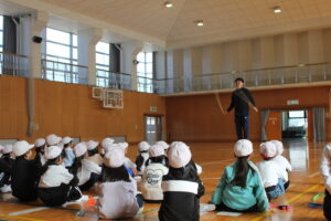 授業では、1年生のみんなに、上手に前跳びをするコツを教えてくださいました。