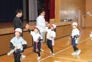 前跳びを上手に跳ぶ3つのコツを教えてもらいました。また、「すぐには上手にならないこと」や「繰り返し反復練習をすることで上手になること」も教えてもらい、何度も繰り返す中で、少しずつ上手になっていました。