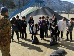 4年生が、総合的な学習の時間の一環として、自衛隊の美濃加茂地域事務所から4名の隊員をお招きし、防災体験を実施しました。体験内容は「救急時✙の担架づくり」「新聞紙📰でのスリッパづくり「自衛隊🚙車両の乗車体験」「土のうづくり」「ロープワーク」です。